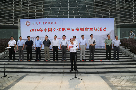 6月13日下午,由安徽省文化厅、安徽大学主办的2014年中国文化遗产日安徽省主场活动启动仪式及“文化遗产进校园”系列活动在安徽大学举行。这是安徽省首次在高校举办文化遗产日主场活动,活动包括安徽省文化遗产摄影展和“黟县百工”展、非物质文化遗产系列讲座与会议、民谣音乐会、安徽(含山)凌家滩遗址公众考古开放日等,活动持续至6月17日。