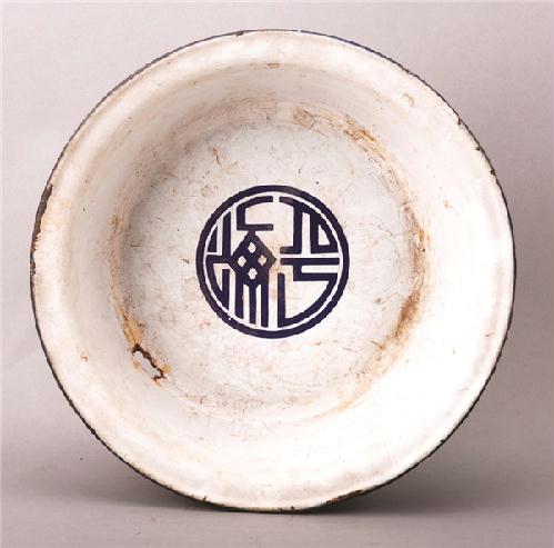 汉口豫成绸缎尼绒局搪瓷脸盆(上径35厘米,底径18厘米,高9.6厘米 ,图二)。该脸盆为搪瓷质地,为汉产“抗战劳军”品。此脸盆内壁饰蓝色花草图案一周,内底部铭有“汉口豫成绸缎尼绒局敬赠”蓝色字样,中心部位有厂家标识“Y”与“C”的交叉图案。