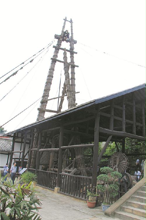 考察的第一站是贡井区的东源井。还没到井口,就能闻到浓烈的天然气味。东源井是自贡盐场至今仍保持传统采气工艺的气井中,唯一的高产低压天然气井,自1892年开始投产以来,一直保持着高产、稳产的纪录,名列自贡盐场气井之冠,是古今中外罕见的气井。据介绍,东源井从凿成到现在虽经一百多年,地面的设施依然保存如旧,碓房、井架、踩架、大车等都遗存较好,是珍贵的晚清盐史实物。