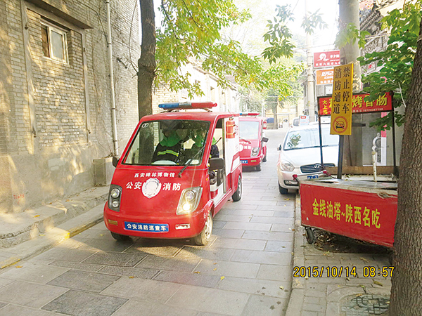 碑林的小型消防车除了用于馆内消防,还用于周边地区的巡查,在狭窄的小巷如鱼得水,充分发挥了治安巡逻、消防灭火及警戒威慑作用。2013年5月,后门巷子一家水盆羊肉店用甲醇做饭,甲醇泄漏发生火灾,社区的人一报警,小型消防车第一时间赶到扑灭。这家羊肉店后来又着了火,在碑林的要求下,消防局关了这家门店。
