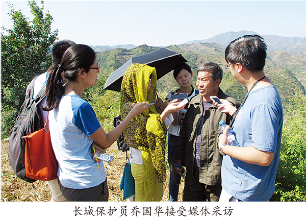 说到长城保护工作中难忘的经历,乔国华提及的都是三年前甚至十年前的事儿。2005年,有人撬下一块长城砖打算拿回家镇宅,乔国华紧追不舍,终于将偷城砖的人拦下,经过一番说服教育,此人乖乖地将城砖搬回原处。三年前,听说有人开警车拉走一块城砖,乔国华立即追赶劝阻。此人说城砖是捡的,不是撬的,乔国华说,长城砖是文物,归国家所有,捡的也不能据为己有。此人心悦诚服地将城砖交还,还开车送乔国华回家。