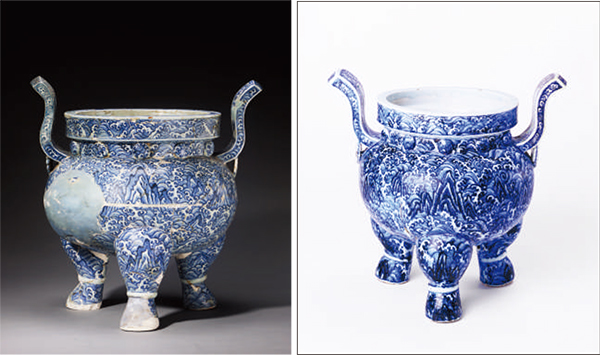 在明清两代,景德镇御窑是专门为皇帝生产御用瓷器的基地,紫禁城是这些御用瓷器的唯一合法使用地。至今,北京故宫博物院和台北故宫博物院是收藏明代御窑瓷器的主要单位,包括龙泉窑、磁州窑、钧窑等不同窑场的产品在内,总数超过一万件,而且多是清宫旧藏,传承有序。御窑烧造的合格品被源源不断地送进紫禁城的同时,在严格挑选标准下的落选品和残次品均被集中销毁。经考古发掘,御窑遗址出土的这些落选和残次御窑瓷器,多可以与传世瓷器进行器型、纹样的对比。如在本次展览中,有一件御窑遗址考古出土的永乐青花海水纹双耳三足炉。该炉通体绘青花山石海水,器物造型雄伟,海浪纹气势磅礴。与之同时对比陈列的,是故宫博物院藏的一件传世品,两炉的器型、纹样几乎完全一致。在御窑生产的产品中,有的品种仅见于传世品而在出土品中不见;相反的,仅见有出土品而未见传世品的例证也同样存在,更有当时研发的新品种以及试烧之未成功者:展品中景德镇市陶瓷考古研究所藏的宣德斗彩鸳鸯莲池纹盘,以及永乐红釉点彩碗就是比较典型的例子,这两种器物在传世品中均未曾见到与之相同的。通过对御窑瓷器研究和御窑遗址的考古发掘,以及对御窑、民窑瓷器的比较研究,可以发现在御器厂主导下的技术创新、研发和对外来技术的引进,在促成御窑生产技术提高的同时,对景德镇乃至全国瓷器生产的带动作用、对十四世纪以来世界各地瓷器生产风尚的引领作用。