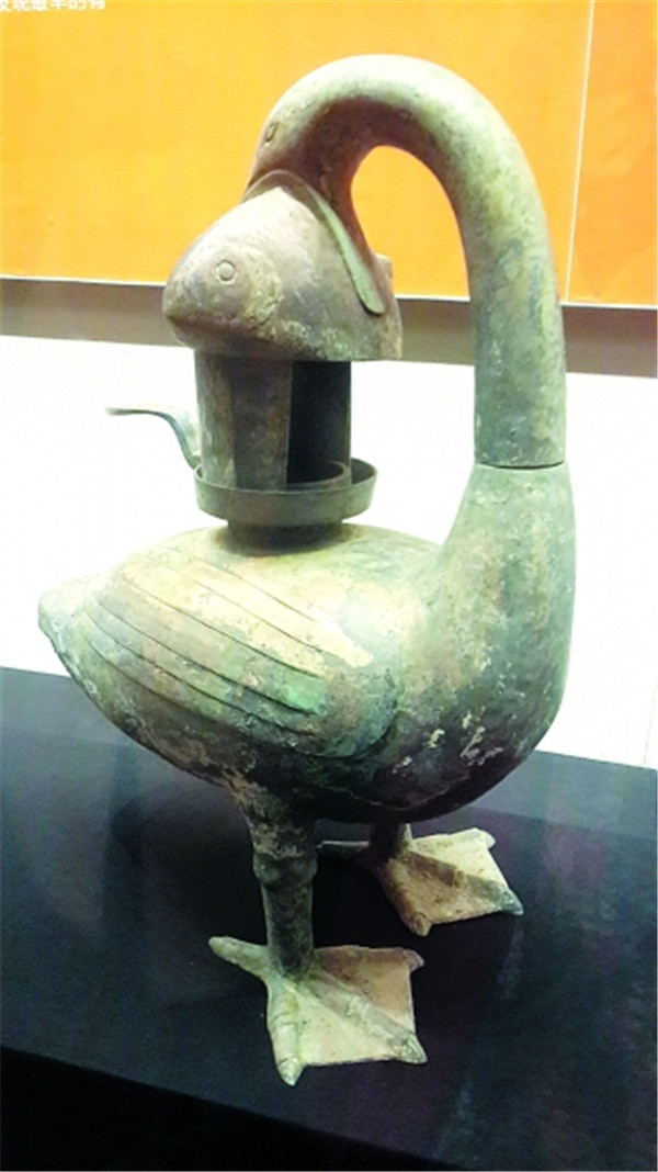 展品中还有不少青铜器。记者注意到,大多是素面的,没有常见的先秦时期青铜器那种繁复的纹饰。刘庆柱说,这是一种文化的流变。每个时代都有代表性的器物种类,先秦是青铜,汉代青铜文化已走向衰落,唐代金银器崛起,宋以后则以瓷器为代表。他特别向记者介绍了一件银制当卢。当卢是马匹前额的装饰,并非罕见,但难得的是这件银当卢雕刻的是一只大角羊。记者不由想起甘肃马家塬出土的战国时期戎族的车马上,有大量这种大角羊的图案。刘庆柱说,这是丝绸之路开通后,西域文化在内地的一种体现。能体现这种文化交流的,还有一件黄釉的双系青瓷壶。由此可见,刘贺不仅是一位音乐爱好者,而且还颇能接受外来文化呢。
