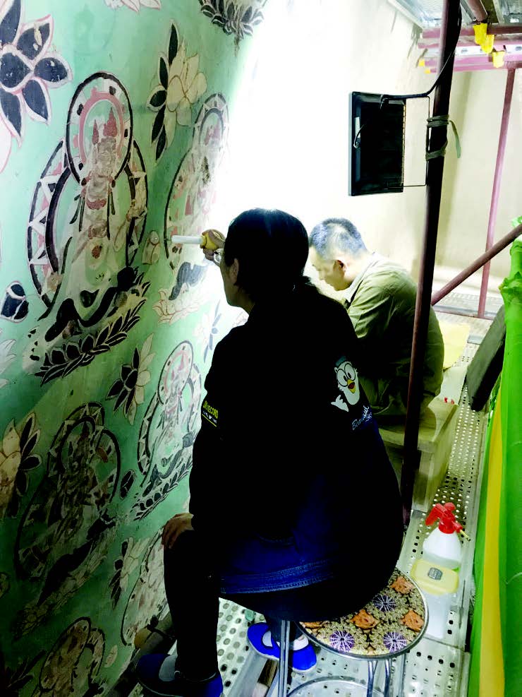 工作人员在130 窟里修复壁画