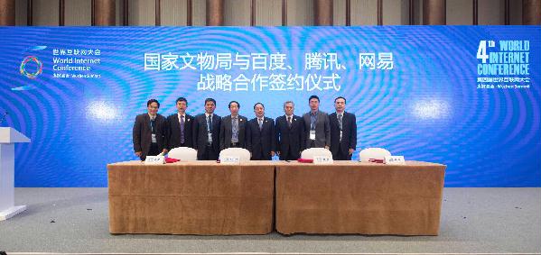 12月4日,国家文物局与百度、腾讯、网易三家互联网企业的战略合作协议在乌镇签署。国家互联网信息办公室副主任任贤良、文化部副部长项兆伦、国家文物局局长刘玉珠见证签字仪式。国家文物局副局长关强分别与百度公司副总裁王海峰、腾讯集团副总裁程武、网易公司副总裁庞大智签署战略合作协议。 根据协议,国家文物局与合作企业将秉承优势互补、开放合作、长远发展的理念,遵照政府引导、市场运作、资源共享、合作双赢,以中华文明的传播与弘扬为原则,通过观念创新、技术创新和模式创新,加快推进互联网与文物资源的跨界融合。 将与百度联合搭建文物百科网络平台,百科数字化博物馆,文化遗产复原以及相关文物的信息智能化展示,大数据支撑的公共服务新模式,建设以人为本、服务领先的文化信息服务体系,为社会公众提供多样化的文化创意产品以及高质量的文化信息服务。 将与腾讯共同构建立体化、多元化媒体矩阵,探索数据开放路径,推进文物信息资源开放共享,内容集聚互联网+文物教育,智慧博物馆建设,渠道拓展互联网+文物文创、文物旅游创新,打造集信息发布、文物信息资源开放、智慧服务能力合一的“互联网+中华文明”的权威平台。 将与网易共同推进在线教育平台建设,开展青少年寓教于乐活动,在电商平台增设专有品牌文创产品,推进博物馆体系与互联网平台互联互通,进一步盘活用活文物资源,为公众提供多样化的文化创意产品与优质服务,共同推进“互联网+中华文明”相关项目的建设和推广应用。(郭桂香 摄影:张若梦 )