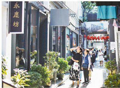 走在如今的永庆坊,处处人潮涌动,现代气息与传统文化相互交织。其中文化创意类商户达26家,包括剧场影像、文化体验、创意手工、文化传播等品类,约占全部商户的八成,吸引了大批游客尤其是年轻人的到来。