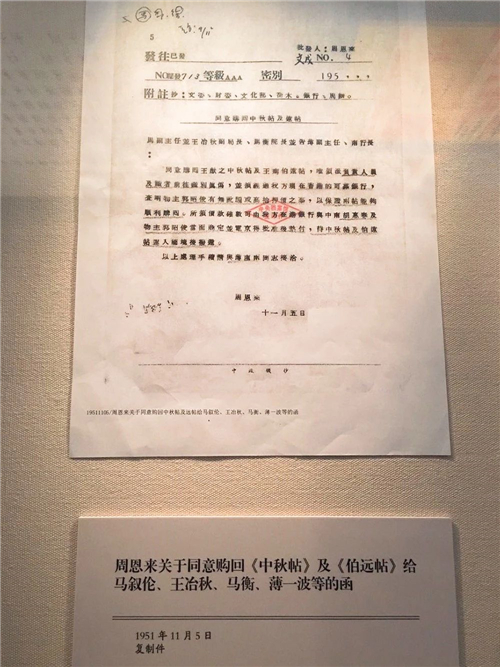 展览中展出了1951年11月5日周恩来总理的一页指示:“同意购回王献之《中秋帖》及王珣《伯远帖》。惟须派负责人员及识者前往鉴别真伪,并须经过我方现在香港的可靠银行,查明物主郭昭俊有无讹骗或高抬押价之事,以保证两帖顺利购回。所需价款确数,可由我方在香港银行与中南胡惠春及物主郭昭俊当面商定,并电京得批准后垫付,待《中秋》及《伯远》运入国境后拨还。以上处理手续,请与薄、南两同志接洽。”
