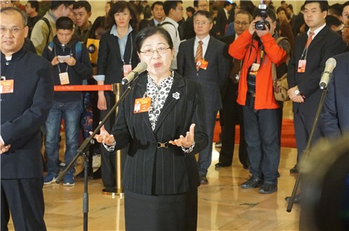 3月3日下午2时,全国政协十三届二次会议首场“委员通道”在人民大会堂一层中央大厅北侧举行。全国政协委员、故宫博物院原副院长宋纪蓉在“委员通道”回答记者提问。