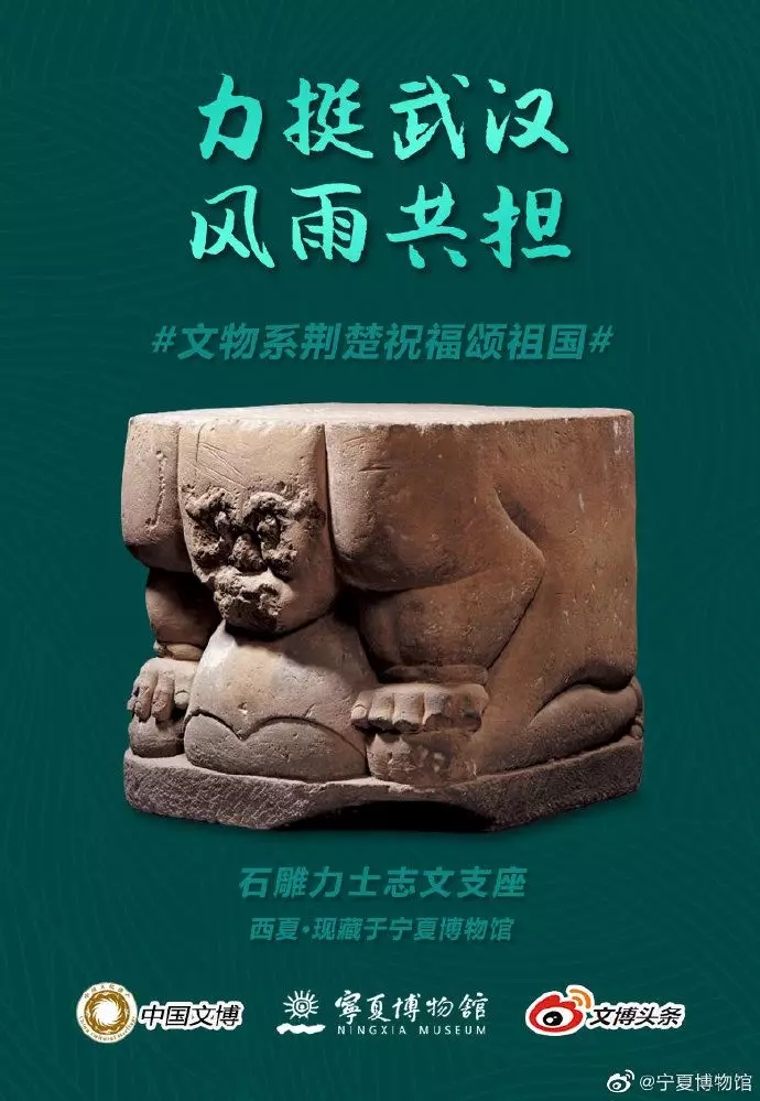 此外,宁夏博物馆积极响应国家文物局开展的“文物系荆楚,祝福颂祖国”接力活动,挑选馆藏西夏石雕力士志文支座,制作海报,以白砂石圆雕男性力士像,通过坚硬的质地、有力的线条、磅礴的气势等表现了负重者坚忍不拔的毅力,彰显了决不为困难所屈服的气概,寓意全国人民勠力同心、众志成城、风雨共担,既传播博大精深的历史文化,又传递共克时艰的精神力量,表达出文物系统齐心协力、战胜疫情的坚定信心。