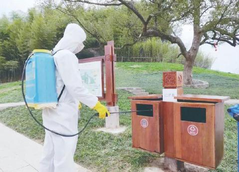 工作人员对良渚古城遗址公园内进行全面消杀不留死角,确保观众健康安全参观