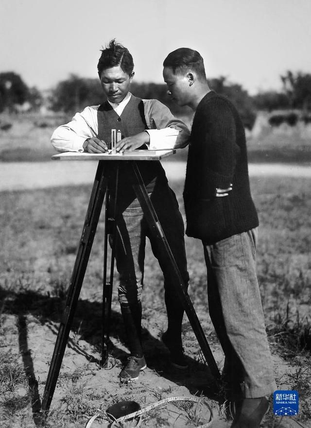 殷墟第一次发掘,董作宾(右)参与测量绘图(资料照片)。新华社发(安阳市殷墟博物馆提供)