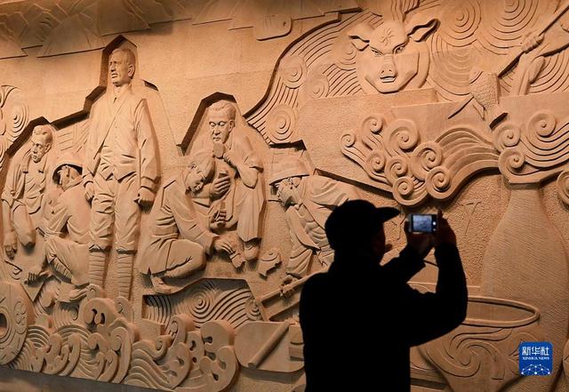 参观者在仰韶文化博物馆内拍摄浮雕(10月15日摄)。新华社记者 李安 摄