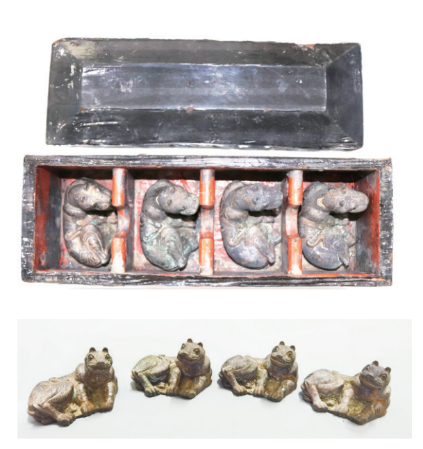 西汉漆盒虎形铜镇,盒呈长方形,木胎漆器,子母口,朱里玄表,素面无纹。铜镇作虎形,通体错银,并镶 嵌红铜。