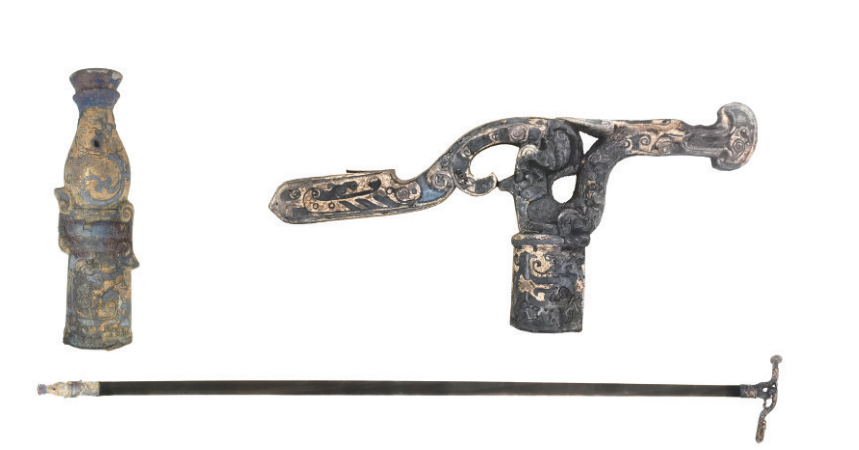 西汉木柲铜杖,杖通长175厘米,以龙为首、以凤为 鐏,通体错银,并镶嵌红铜。