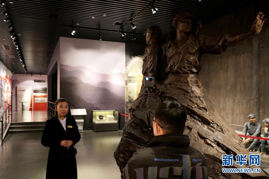 1月26日,在中国工农红军第二方面军长征出发地纪念馆,讲解员(左)在介绍一尊雕像,雕像中的三位红军都是独臂,红二方面军出了三位“独臂开国将军”——贺炳炎、余秋里、晏福生。新华社记者 苏晓洲 摄