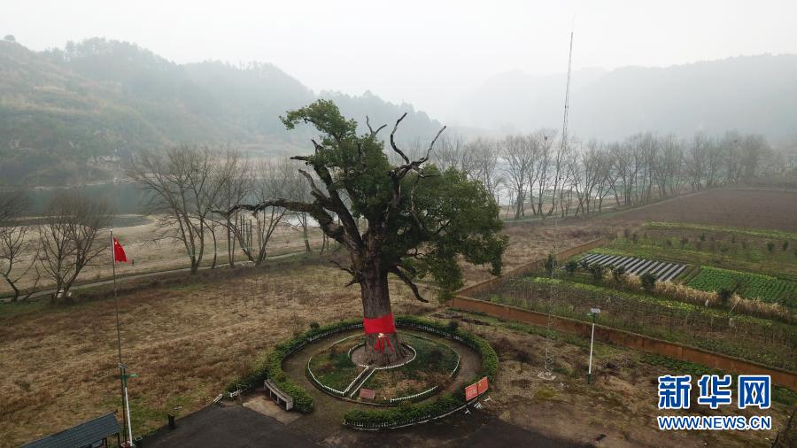 这是1月28日在湖南省张家界市慈利县溪口镇樟树村拍摄的“红军树”(无人机照片)。新华社记者 陈振海 摄