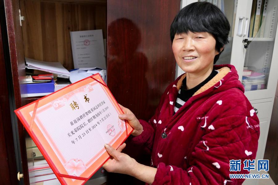 1月26日,湖南省张家界市桑植县洪家关光荣院院长贺晓英展示“返聘证书”。30多年来,贺晓英服务过100多位革命老人。新华社记者 苏晓洲 摄