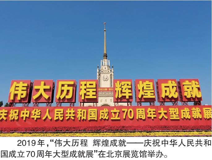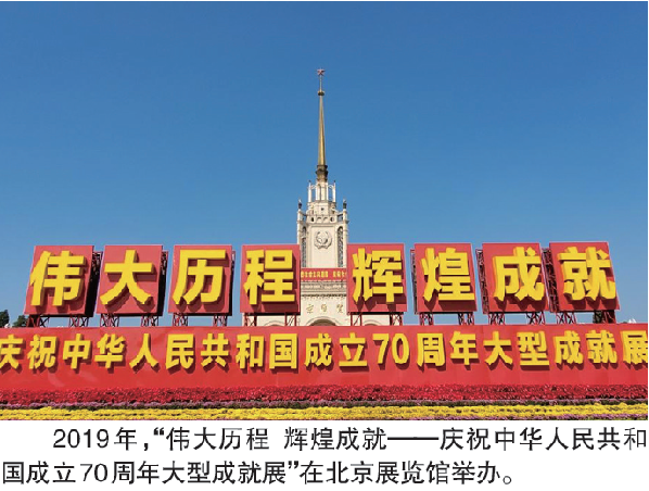 2019年9月23日,习近平总书记来到北京展览馆,参观“伟大历程 辉煌成就——庆祝中华人民共和国成立70周年大型成就展”。他强调,要展示好、宣传好新中国波澜壮阔的发展历程、感天动地的辉煌成就、弥足珍贵的经验启示,激励全党全国各族人民更加紧密地团结在党中央周围,高举中国特色社会主义伟大旗帜,团结一致、锐意进取,为决胜全面建成小康社会、夺取新时代中国特色社会主义伟大胜利、实现中华民族伟大复兴的中国梦、实现人民对美好生活的向往而不懈奋进。