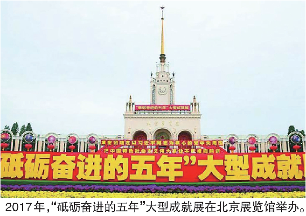 2017年9月25日,习近平总书记在北京展览馆参观“砥砺奋进的五年”大型成就展。他强调,要广泛宣传党的十八大以来党和国家事业发展的生动实践、重大成就、宝贵经验,唱响主旋律,弘扬正能量,激励全党全国各族人民坚定中国特色社会主义道路自信、理论自信、制度自信、文化自信,振奋精神、砥砺奋进、再接再厉,深入推进伟大斗争、伟大工程、伟大事业,为实现“两个一百年”奋斗目标、实现中华民族伟大复兴的中国梦继续奋斗,迎接党的十九大胜利召开。