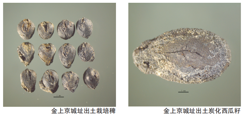 开展历史时期植物考古,可以令那些通过古代陆路、海上丝绸之路传入我国的植物资源,跳出古代文献可能存在的指代不明、背景混乱,从而更加清晰、准确地为我们所认识。在辽上京城址一处金代普通民居附近的灰坑中,发现了一粒西瓜籽和两粒葡萄属果实种籽,应该为当时人们的食余。在金上京遗址的一处灰沟中,我们也同样发现了一粒西瓜籽。有关西瓜最早的文献记载见于辽代的《胡峤陷虏记》,而在内蒙古敖汉旗羊山一号辽代墓葬壁画中,则发现了最早的“西瓜图”。两处城址发现的实物证据显示了辽代传入的西瓜,在金代时的北方地区应当已经相当普遍,并且可能已经为百姓们所食用。辽上京城址发现的葡萄属种籽,其形态特征不同于西方传来的葡萄,应是我国本土生长的葡萄。我们知道,西方葡萄大致在西汉时期开始进入我国内地,河北宣化辽墓中曾出土有一串已经干瘪的葡萄,证明辽代时食用葡萄已经出现在高等级贵族的日常生活中。辽上京城址中本土葡萄属种籽的发现,说明在西方葡萄被贵族人群食用的同时,本土葡萄也仍然是古人们的水果来源之一。