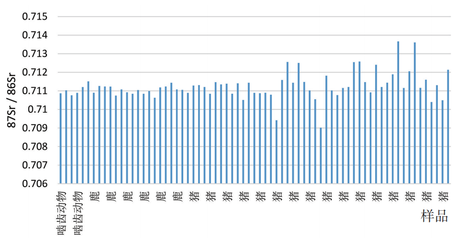 接下来需要解决的问题就是如何确定某一地区的锶同位素比值特征。可以用当地哺乳动物遗骸的锶同位素比值的平均值加或减二倍的标准偏差作为区分当地和外来人口的生物可利用锶同位素比值的置信区间,由此建立一个评估古代人口迁移情况的相对客观的标准。从这个角度而言,考古学具有无可替代的优势——提供考古发掘出土的古代动物和人类遗骸样品。