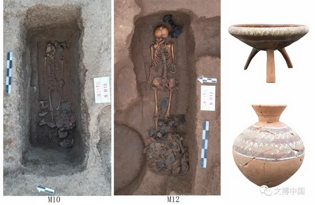 墓葬集中分布于这批房址西部,12座竖穴土坑墓葬具均为单棺,明显分成三组,西北部2座为单人二次葬大墓,东部10座中7座双人一次合葬墓紧凑成团,3座为单人一次葬。另有3座瓮棺葬位于成人墓东侧房址附近。二次葬大墓1座带有脚箱,棺下均有枕木,除出土大量陶器和较多玉器外,另有鹿角锄、鹿角叉形杖、鳄鱼骨板、骨杖形器、陶鼓、龟甲器等礼制随葬品。7座合葬墓都是年龄相近的成年男女双人合葬,有随葬龟甲器、猪、狗的现象。单人葬规模略小,均见彩绘陶器。瓮棺葬葬具为倒扣陶鼎,人骨经鉴定均为不足月胎儿,初判为流产所致。