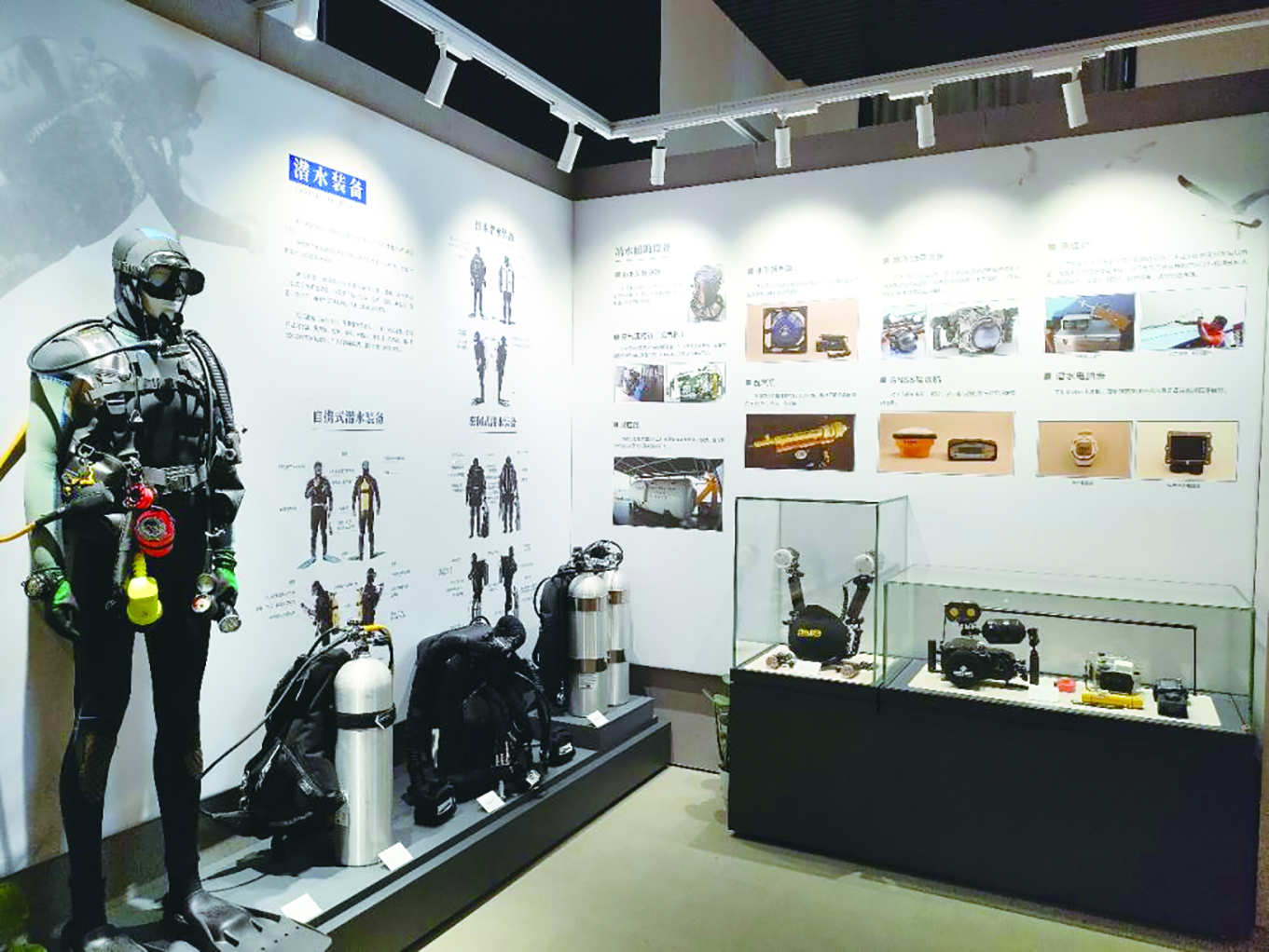 “扬帆起航”单元主要介绍山东省成立山东省水下考古研究中心、水下考古学科与工作流程,同时以电视循环播放水下考古工作场景。“长风破浪”单元以图示和实物相结合的方式展示了水下考古的潜水装备和探测装备。“工欲善其事,必先利其器”,目前山东省水下考古研究中心已投资1500余万元采购了多波束测深仪、旁侧声呐仪、海洋磁力仪、水下机器人、水下照相机、潜水装备等水下考古设备,为水下考古工作奠定坚实的基础。