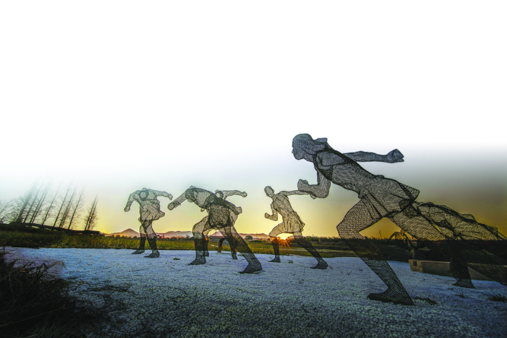 图为良渚古城遗址内劳作的先民雕塑。在熹微的晨光中,良渚先民似乎迎来了重生,正带领我们走进一个古老而辉煌的神王之国。