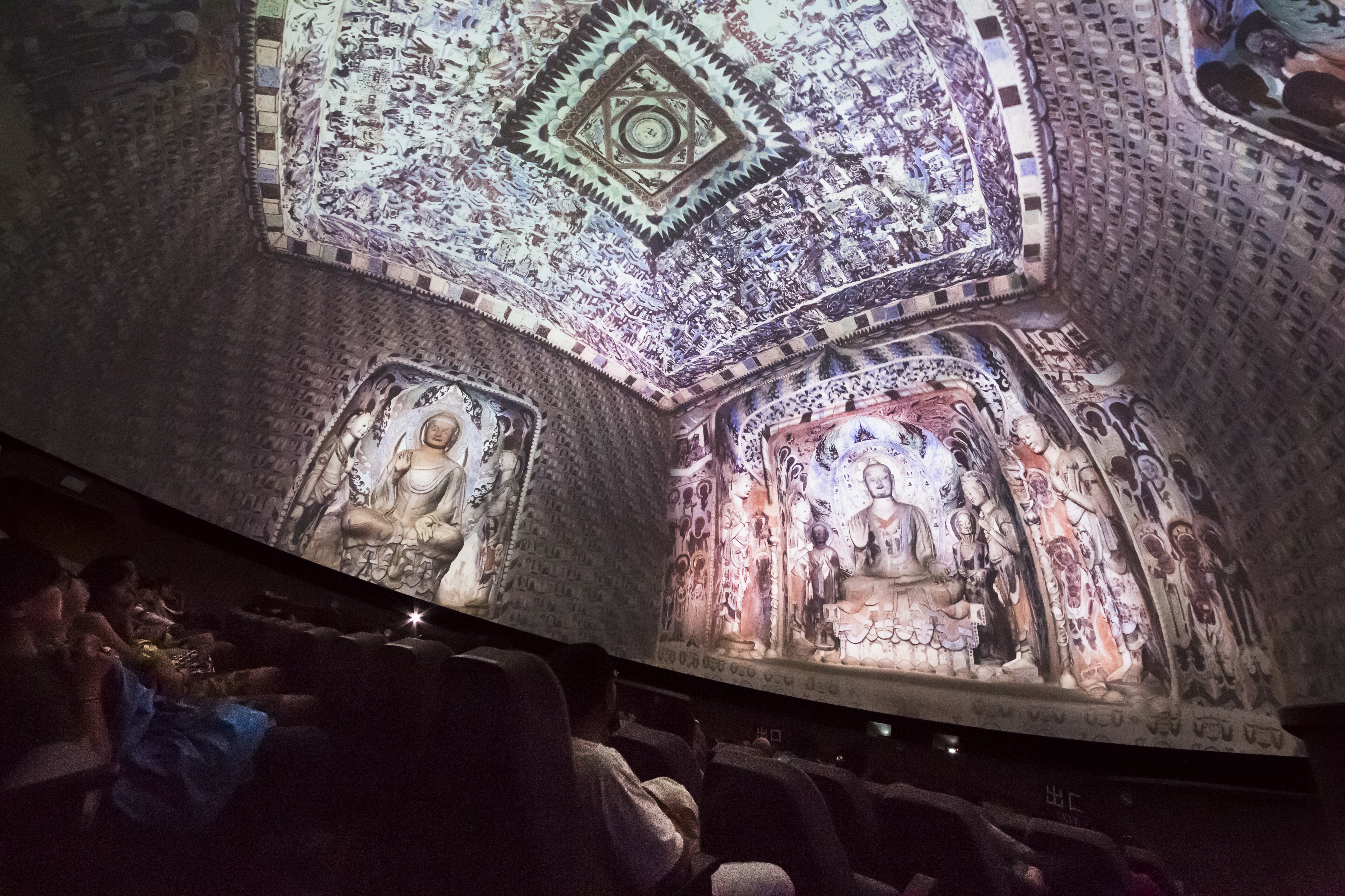 游客在敦煌莫高窟数字展示中心观看球幕电影