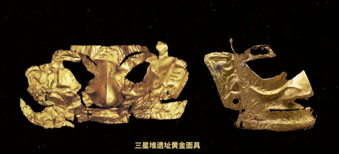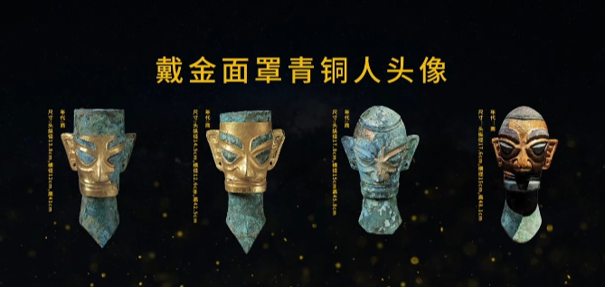 也出土了相似的黄金面具 以及贴有黄金的青铜人头像 它们诉说着三星堆和金沙 一脉相承、同宗同源的故事