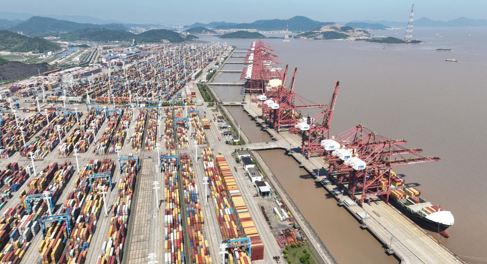 货轮停靠在宁波舟山港穿山港区装卸货物(2023年5月9日摄,无人机照片)。新华社记者 翁忻旸 摄