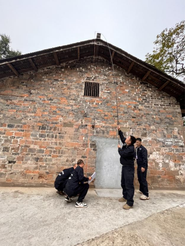 “高6.2米”,泡桐湾民居旁,普查队员杨海涛正在用自制的鱼竿测高器测量民居的侧面高度,随着声音落下,数据被记录在册。鱼竿顶上固定着回形针,再挂上卷尺,就可以对激光测距仪无法触及的挑檐等较高的建筑部位进行测量。