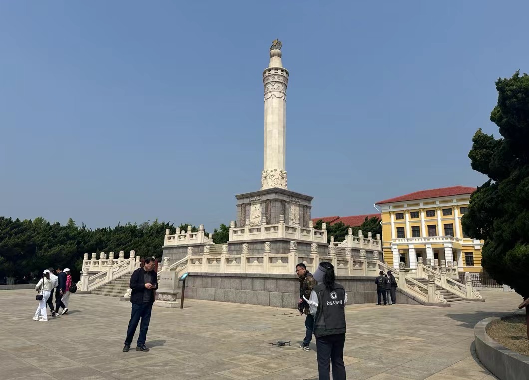 在中苏友谊纪念塔前,旅顺口区文物部门及文博单位专业人员组成的四普小组,正在对文物本体进行数据采集。东北地区第四次全国文物普查工作正有条不紊地进行中。
