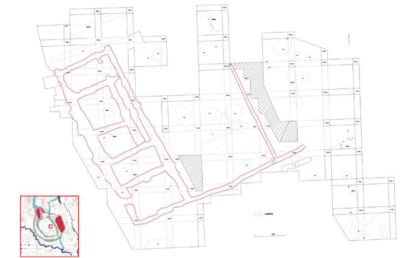 在遗址中部台地发现一座大型凹字形院落建筑,面积约800平方米。建筑基槽结构复杂,工艺与现代农村建房流程相近。墙体拐角以红烧土混合夯土加固,部分位置设有墙墩防垮塌,个别区域还发现可能与祭祀活动相关的木棺遗存。室内存在壁柱及直径约40厘米的大型柱洞,隔断墙划分出多个功能空间。