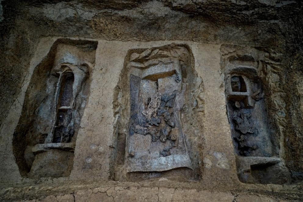 从墓葬规模来看,遗址包含大、中、小三类墓葬。大型墓葬中可见特殊的对接现象,如M112墓葬由三个独立墓室构成,室间以生土与人工土块构筑的隔梁分隔。各墓室均配备葬具,墓坑揭露后可见多组磨光陶罐,陶罐内发现禽类骨骼,表明其下葬时盛装有食物。