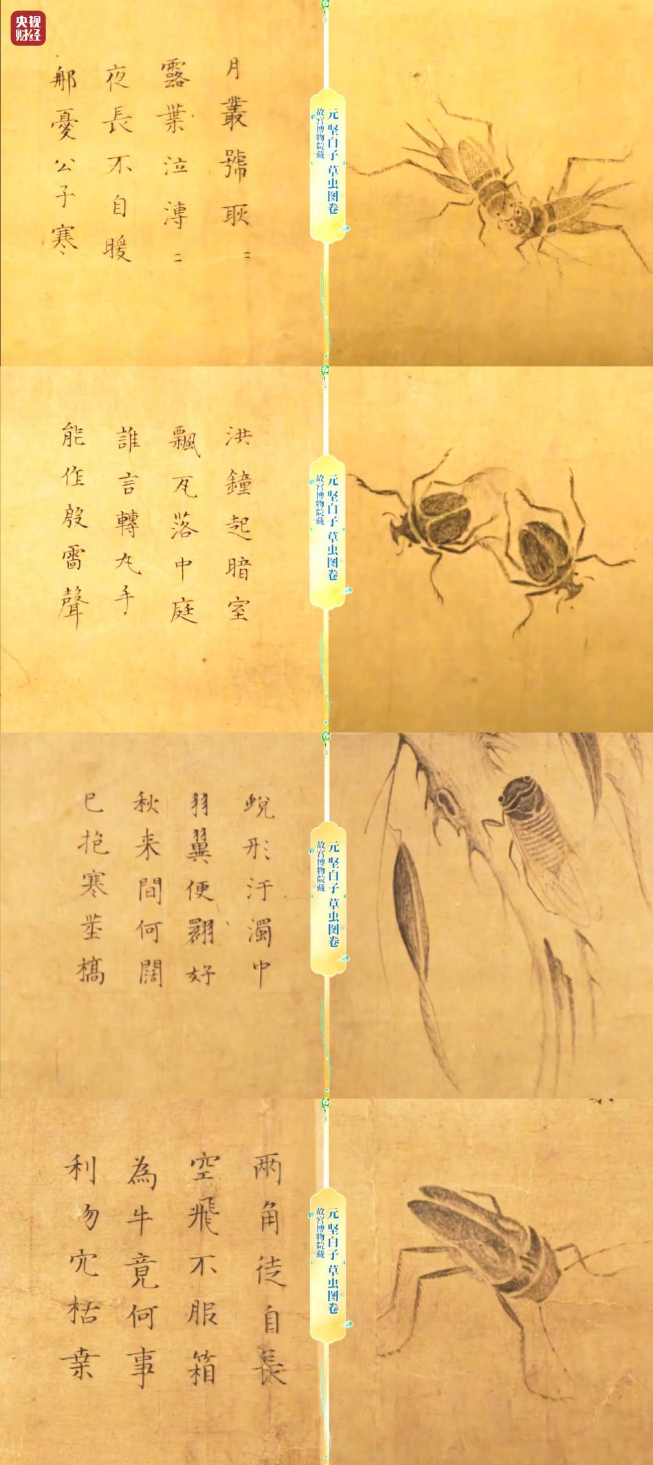 现藏于故宫博物院的元坚白子的《草虫图》卷则是诗画交融的作品。此图依据苏轼《题雍秀才画草虫八物》诗意而作,延续了宋代写实画作的细腻风韵,每种动物都造型逼真,笔墨勾染清疏淡逸,尽显自然天趣的意味,是元代草虫题材绘画的代表作。配合苏东坡的神来之笔,画中昆虫的特性更加生动:天牛的触角如戟、蝉的羽翼通透、蟋蟀声音短促。古人将对昆虫的细致观察藏于笔墨之间,这些跃然纸上的动物,不仅是自然的缩影,更是中国人对天地万物的热爱与敬畏。