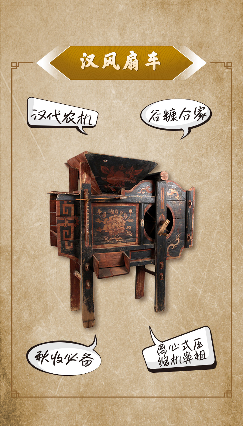 汉风扇车现藏于中国农业博物馆。风扇车是一种清选谷物的脱粒工具,在现代农业机械普及前,综合了多个物理原理的风扇车,曾是“机械化”程度最高的农具。摇动风扇车侧面的曲柄,让风扇转动产生气流,饱满的谷粒在重力作用下从出料口流出,而谷壳、糠皮等较轻的杂物从出风口吹出,谷粒与杂物即可分开,摆脱了“扬谷法”对天气的依赖,减轻劳动强度、提高劳动效率。