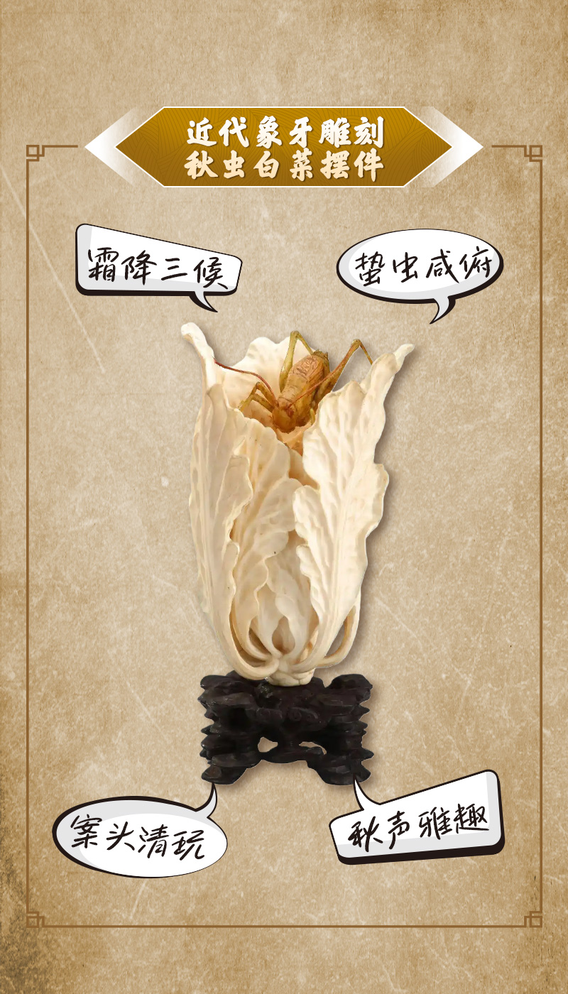 霜降有三候:一候豺乃祭兽,二候草木黄落,三候蛰虫咸俯。当草木凋零、百虫入穴冬眠之时,这件近代象牙雕刻秋虫白菜摆件,以极致工艺凝结了晚秋的生机,于方寸之间,尽显匠人对自然万物的细致观察与精湛技艺。