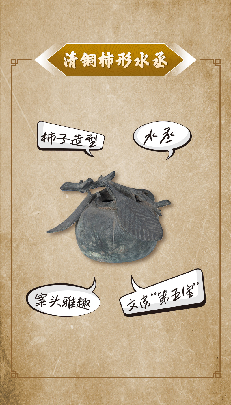 “我是文房里的一个小器具,用来为砚台添水。与常见的圆腹水丞不同,我被打造成一枚成熟的柿子,果柄、弧度和底部的棱,都照着真实果子制成。秋后柿子红,我猜,我的主人把我放在案头,或许是想安放他的心境和雅致吧。”