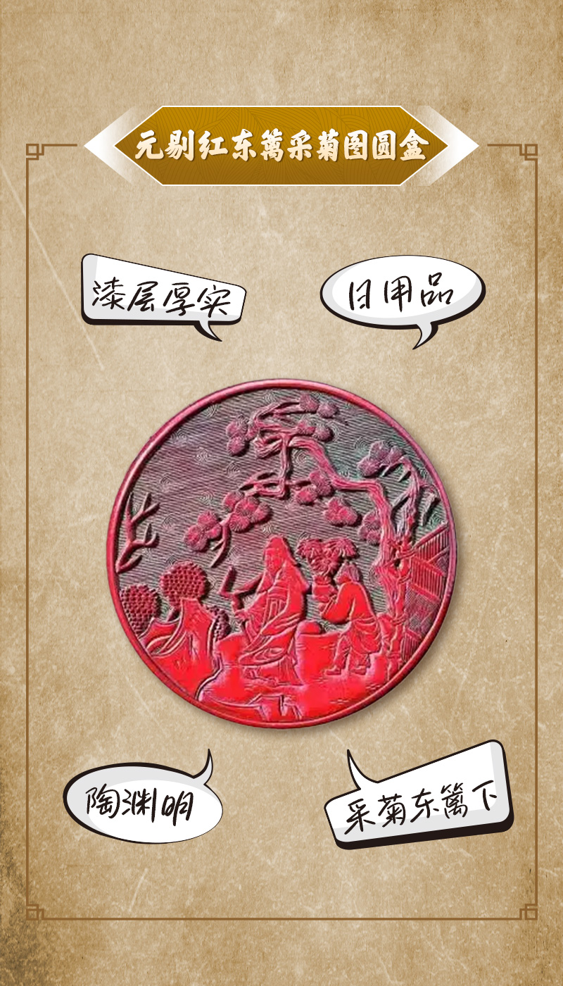 “大约700年前,匠人先在我的身上层层髹漆,待漆层半干,描上画稿,便可在厚厚的漆层上雕刻:一位头戴风帽的老人执杖缓行,身后一侍童捧着盛开的菊花。深秋时节,百物敛声而菊正盛,‘采菊东篱下’的悠然意境,就这样凝固在我身上。虽然我肚子里的物品早已不知所踪,但经过了时间的洗练,我依然散发光彩,完好无缺。”
