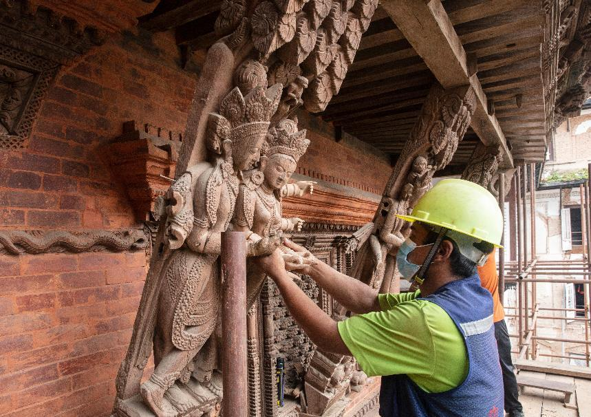 对此,尼方专家曾表示不解,认为修补残损木构件费时费力,倾向雕刻使用新的木构件。经过中尼双方多次现场技术沟通,尼方认可了中国的修复方案。最终,80余位当地技艺精湛的木雕工匠与泥瓦匠受聘开展构件的精细修复、利用与预拼装等工作,3700余件雕刻构件按原型制重做补配,高达85%的老旧构件利用率……一项项数字背后凝聚着中方团队对异国文化的尊重、对文化遗产保护的赤诚。