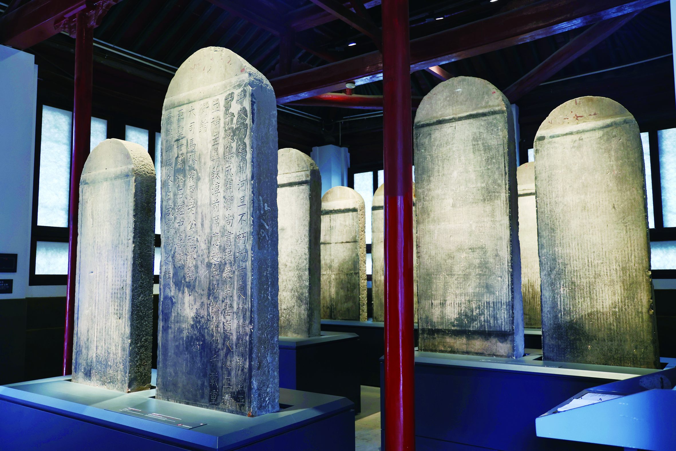 “二重防震”针对一些地震风险大的重要文物,采用馆藏文物一体化防震技术,在石碑底部安装防震平台,所有防震平台均为量身定制,综合考虑该馆所在场地、馆舍结构、石碑展示位置等,根据每块石碑外形、尺寸、重量等参数进行设计,确保文物在地震中的安全性。中轴线第二展室陈列的清刻《孟子》碑刻的基座也全部加装防震平台。