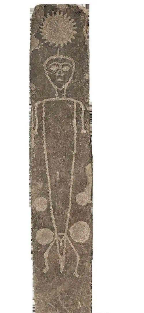 石板上的图案由极简线条构成: 倒三角的身躯 人物面容肃穆凝重 腰部两侧,星辰默默点缀 而人像头顶上方 一轮太阳放射出23道光芒 穿越七千年,依然灼灼如新