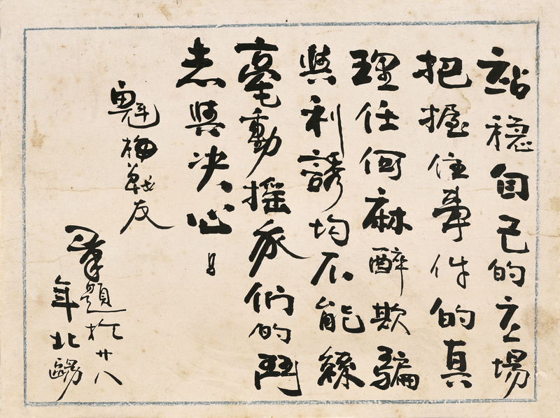 这幅题词是刘英任中共浙江省委书记时在浙江温州写给妻子丁魁梅的赠言。丁魁梅时任中共浙江省委妇女运动委员会主任,领导浙江的妇女运动,刘英的题词是勉励既是革命战友又是妻子的丁魁梅,要坚定革命信念,革命事业高于一切。