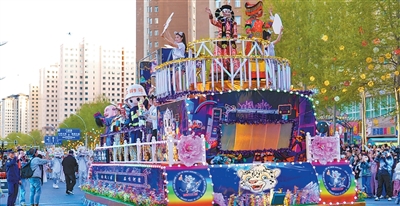 傍晚时分,青海西宁市城北区豹街开启花车巡游。人民日报记者 曹继炜/摄
