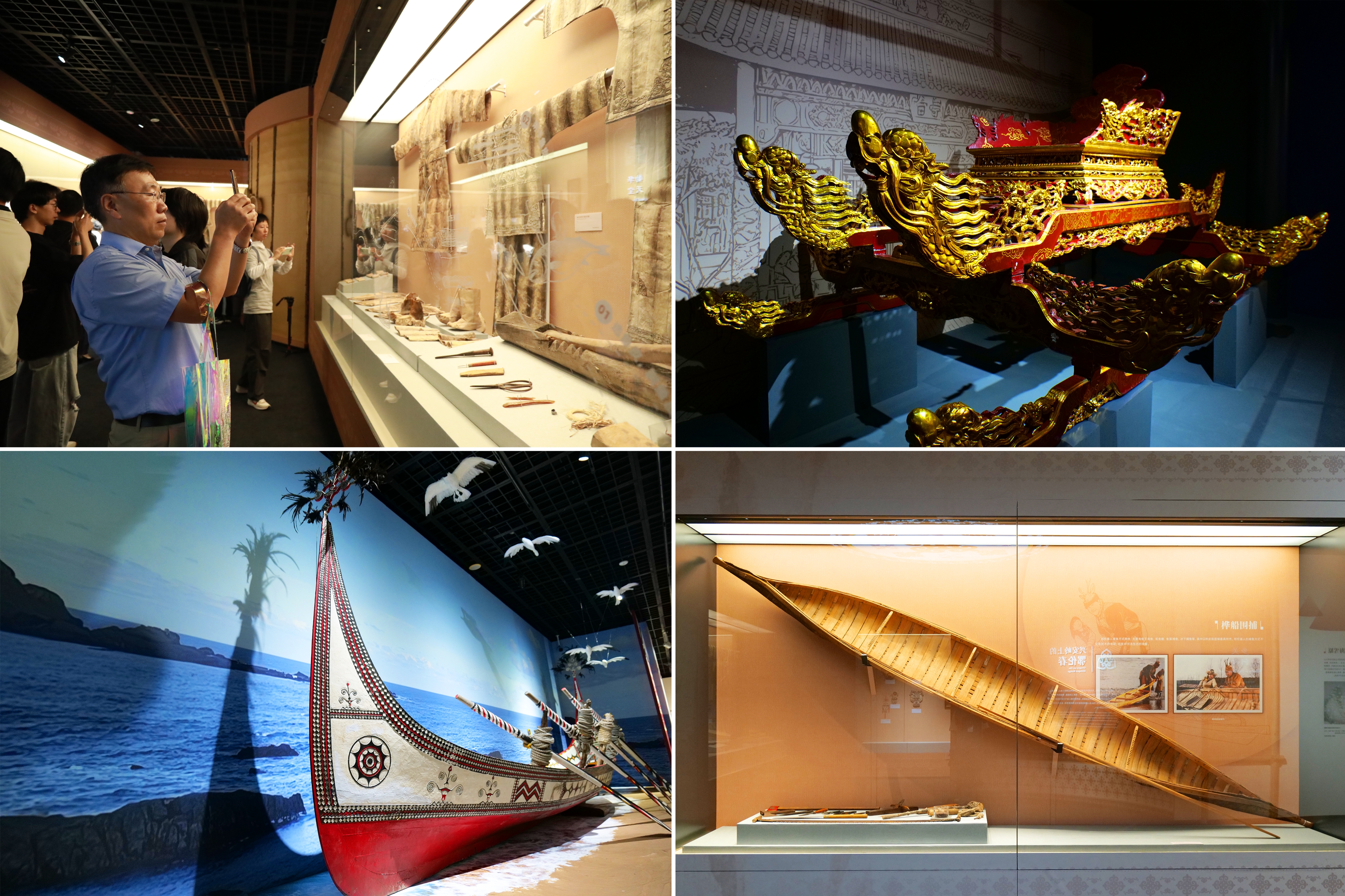 展览以“多元一体”为主题,精选200余件文物,展示了多个民族在渔业生产、舟船制造、民俗信仰等方面的卓越智慧,生动呈现了赫哲族、鄂伦春族、达斡尔族、京族、白族、怒族、傣族、高山族等在江河湖海之间创造的渔文化。展览中,赫哲族的鱼皮衣、鄂伦春族传统手工制桦树皮船、京族哈节迎神车、傣族的传统鱼篓,以及高山族彩绘木雕渔船等众多文物首次集体亮相。
