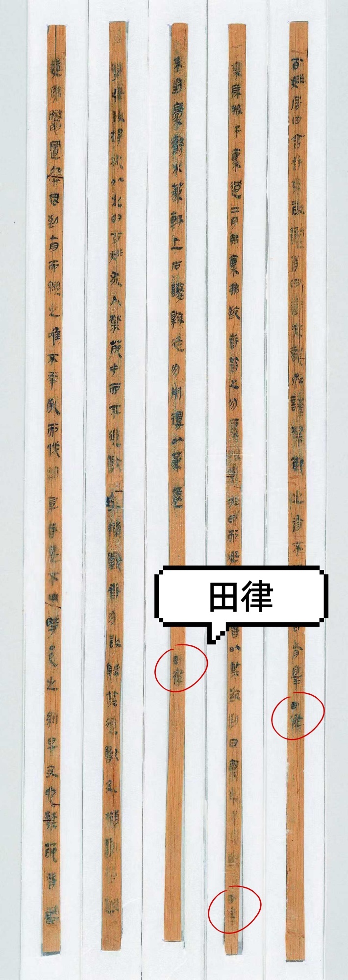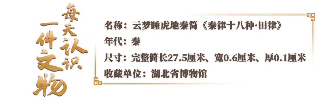 《田律》每支完整竹简上 抄写的字数多在30字以上 每条律文抄写用简的数量不等 一般为三四支 因为会在末尾写明 该条律文所属法律的名称 所以今天的研究者可以按照律名提示 来明确这条律文的归属