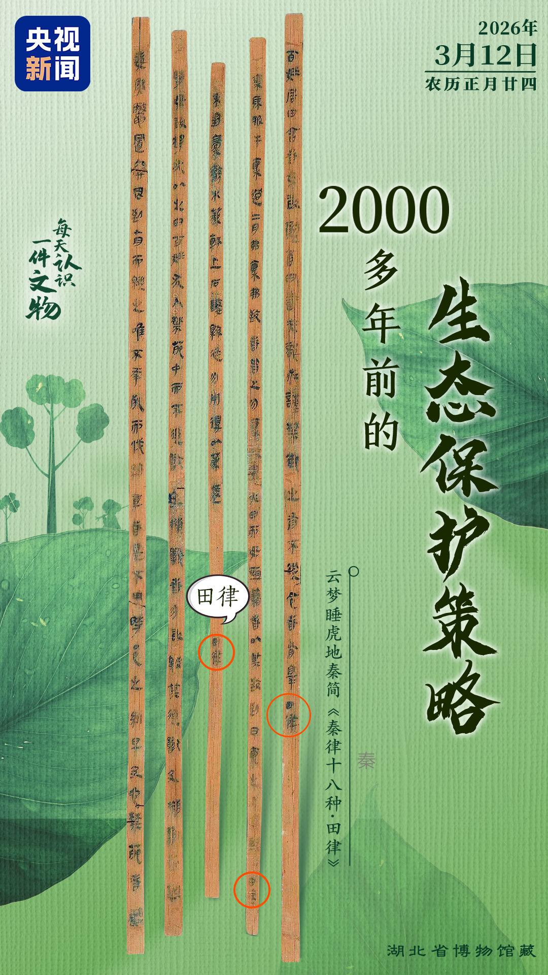 其中《秦律十八种》内包括《田律》 《田律》最亮眼的特点 就是将“天人合一”的生态理念刻进律法 把顺应自然规律做到了极致 被公认为是世界上 现存最早、最完整的环境保护法律