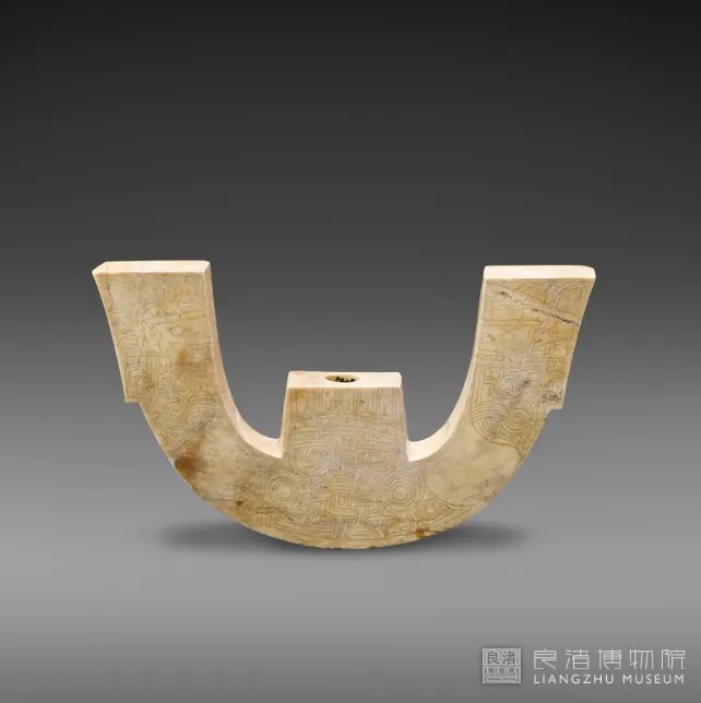 良渚文化神人兽面纹玉三叉形器,良渚博物院藏。三叉形器出土时位于墓主人头部,应属冠帽上的饰物。