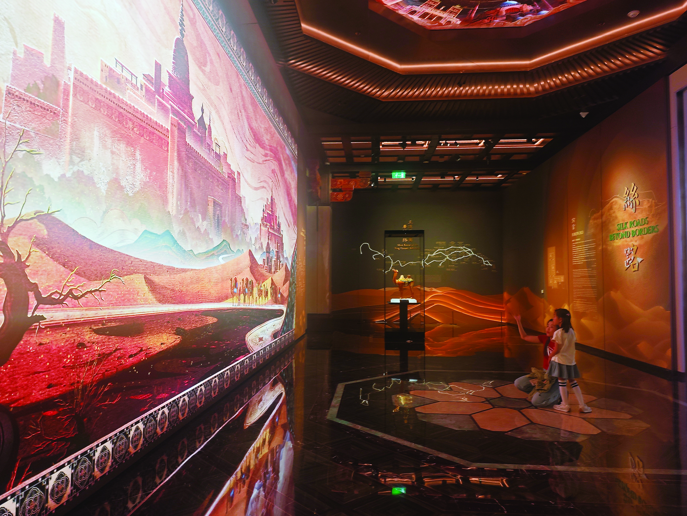 步入展厅,中西交融的设计美感扑面而来:巨型LED屏幕铺陈开瀚海西风的壮阔画卷,穹顶的宝相花纹藻井样式变幻,景泰蓝工艺打造的斗拱错落有致,12个丝路沿线国家文化图腾镌刻于地砖之上。